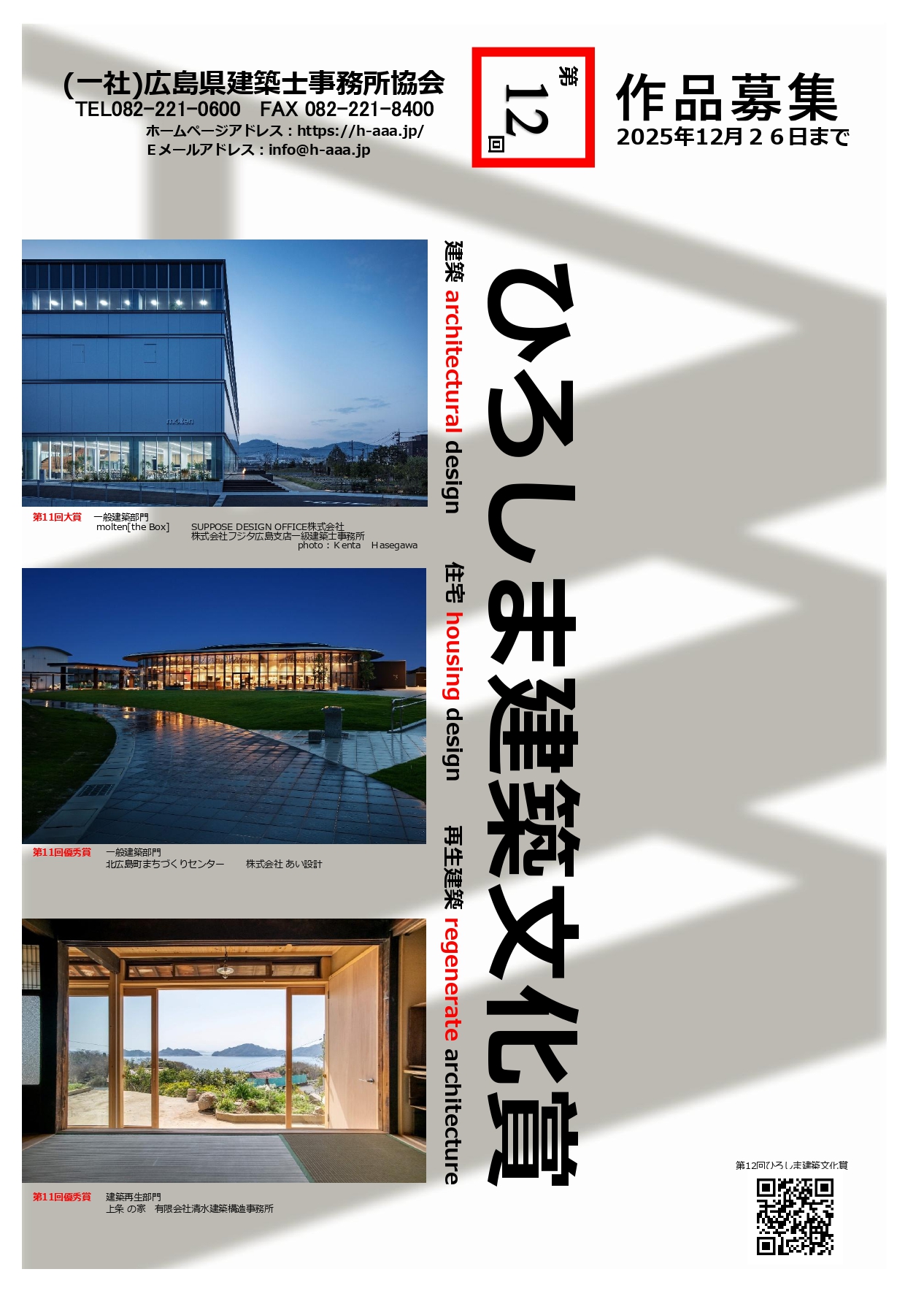 第12回ひろしま建築文化賞の募集期間は令和7年10月1日(水)から令和7年12月26日(金)までです。